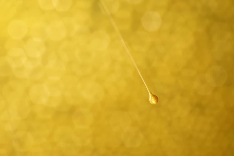 About twenty very thin paint strings with a drop of paint underneath are hanging scattered over the painting.